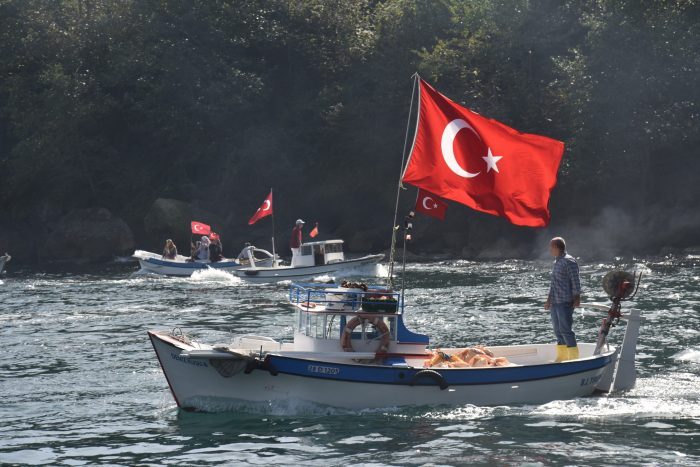 Gülburnu Mevkii’nde toplanan kayıkçılar, kayıklarını Türk Bayrakları ile süsleyerek denize açıldılar. Bu anlamlı hareket, hem bölge sakinleri hem de ziyaretçiler tarafından büyük ilgi ve takdirle karşılandı.